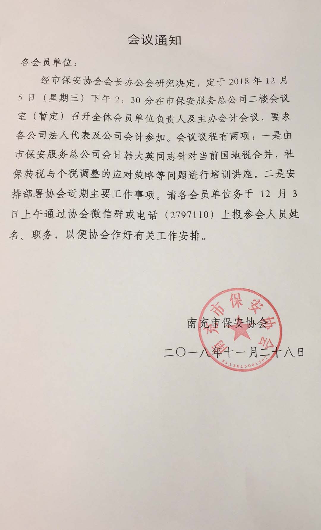 南充保安协会2018年12月5日“会议通知”