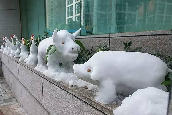 2013年1月,也是密渡桥路建行门口,杜师傅用雪堆了很多小动物,他还在专心创作时,就被很多路人围观,纷纷用手机拍照上传,当时杭城很多媒体也纷纷报道。