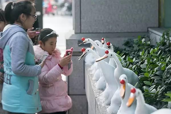 2015年12月6日早晨,杭州建设银行文晖支行门口台阶上,“站着”十来只白色的雪雕作品,天鹅、小牛、小猪、鸽子……过路市民纷纷驻足,掏出手机拍照。不光过路人,银行员工都喜欢杜师傅做的雪雕,打电话到媒体也是银行员工。一夜之间,保安杜师傅又一次红遍网络,网友称他为“雪雕哥”、“最红雪人保安”。